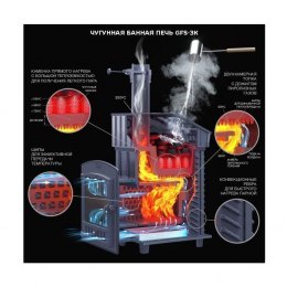 Также печь обладает современным обликом и уникальными техническими решениями. Деление огня из топки на 4 потока и сложная конструкция дымовых каналов с распределительной камерой позволили увеличить КПД печи и сделать нагрев камней в каменке более сильным. Печь передает максимум тепловой энергии от сжигания дров на камни, тем самым сильно снижая температуру дымовых газов на выходе в дымоход, что благоприятно скажется на длительности его службы.