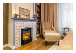 Вместо классических поленьев в очаге используется имитация тлеющих углей.