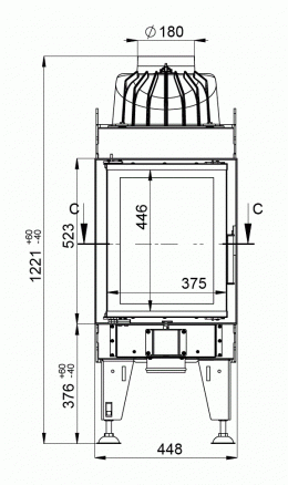 Данная облицовка имеет пристенное расположение. Печь ставится почти в упор к стене. Верхний и нижний бортик, шириной около 3 см, создают зазор необходимый для техники безопасности. Тыльную сторону печи прикрывает лист черной стали. На левой и правой стенках печи есть по два отверстия для отвода тепла. Холодный воздух поднимается с пола, разогревается около топочной камеры и выходит через отверстия в боковых стенках печи.