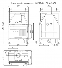 Особенности топки Альфа 700 контргруз:Цельносварной стальной корпусТопочная камера полностью футерована литьевым шамотом, который повышает долговечность топкиСистема 'Чистое стекло'Термостойкая японская керамика Printing с тонированной линией по периметру дверцы (шелкография)Система дожига вторичных газов, которая сокращает уровень выбрасываемого углекислого газаБольшой зольный ящикВстроенная шиберная заслонка с гибким приводом, позволяющая значительно экономить расход дровПлавный механизм подъема дверцыРегулируемая подача первичного воздуха в камеру сгорания, который подается в топку через колосниковую решеткуЛегкий и быстрый монтаж благодаря встроенным ножкам, регулируемыми по высоте.Видеообзор топки Альфа 700 контргруз