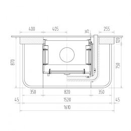 Двухсторонняя топка с большим стеклом. Боковое открывание дверей с двух сторон. Ширина двери 78 см, высота двери 57 см. Современный дизайн дверки, стекло с шелкографией по периметру. Для удобства монтажа в каминный короб топку можно укомплектовать монтажной или декоративной рамкой черного цвета или с отделкой нержавеющей сталью шириной 50 или 80 мм. Топочная камера выложена шамотом бежевого цвета. Подовое горение. Дверца с одинарным стеклом. В качестве опции топку можно заказать с двойным остеклением, для большего комфорта (снижение отдачи лучистого тепла через стекло на 30%). Поворотный чугунный дымосборник облегчает подключение к дымоходу. Топку можно заказать со стальным дымосборником с вертикальным подключением к дымоходу или под углом 45 градусов.