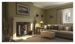 Данное изделие идет в комплекте со специальной насадкой. Через нее внутрь подается воздух из внешней среды. Смотрится эта печная топка превосходно благодаря декоративным особенностям: серебристому оттенку хромированной ручки, лакированной под золото передней панели.