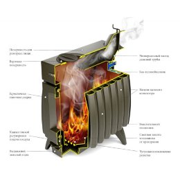 Боковые панели снимают конвекционное тепло со стенок печи и экранируют исходящее от них инфракрасное излучение. Верхняя горизонтальная поверхность вмещает сразу несколько единиц посуды. Сменный чугунный колосник обеспечивает равномерное горение. Печь отличается оригинальным дизайном, поскольку она изготовлена без единого видимого сварного шва.