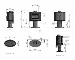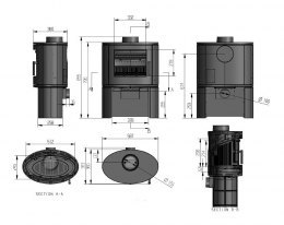 — Материалы корпуса — сталь 4 мм, крышка — сталь 10 мм; детали из чугуна: подовая плита, накладка на дверь, накладка на дровник, фурнитура.