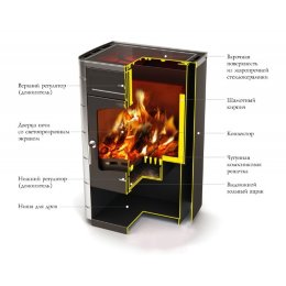 - оснащена двумя регуляторами количества воздуха для горения – первичным (для эффективного розжига и последующей экономии топлива) и вторичным (для улучшения процесса и управления силой горения, для защиты стекла от запотевания и оседания копоти);